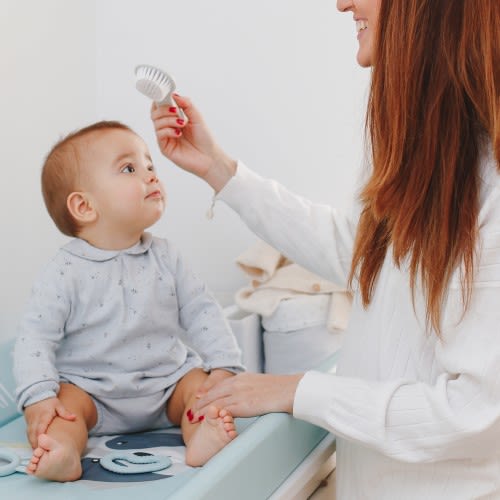 El cepillo con extremos redondeados y fibras suaves es ideal para asear y cuidar al bebé sin dañar su delicada piel y cabello.