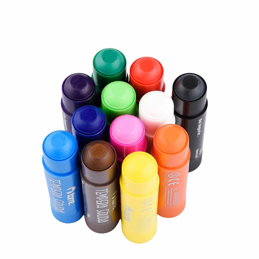 Su formato es similar a los pegamentos en barra, lo cual le permite a los niños abrir y cerrar cada color fácilmente. Este tipo de témperas no necesitan agua ni pincel, por lo que ofrecen mayor limpieza y comodidad que las témperas tradicionales. Además, su secado es ultra rápido y sus colores muy intensos.