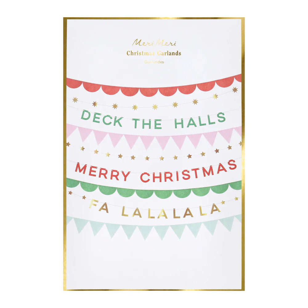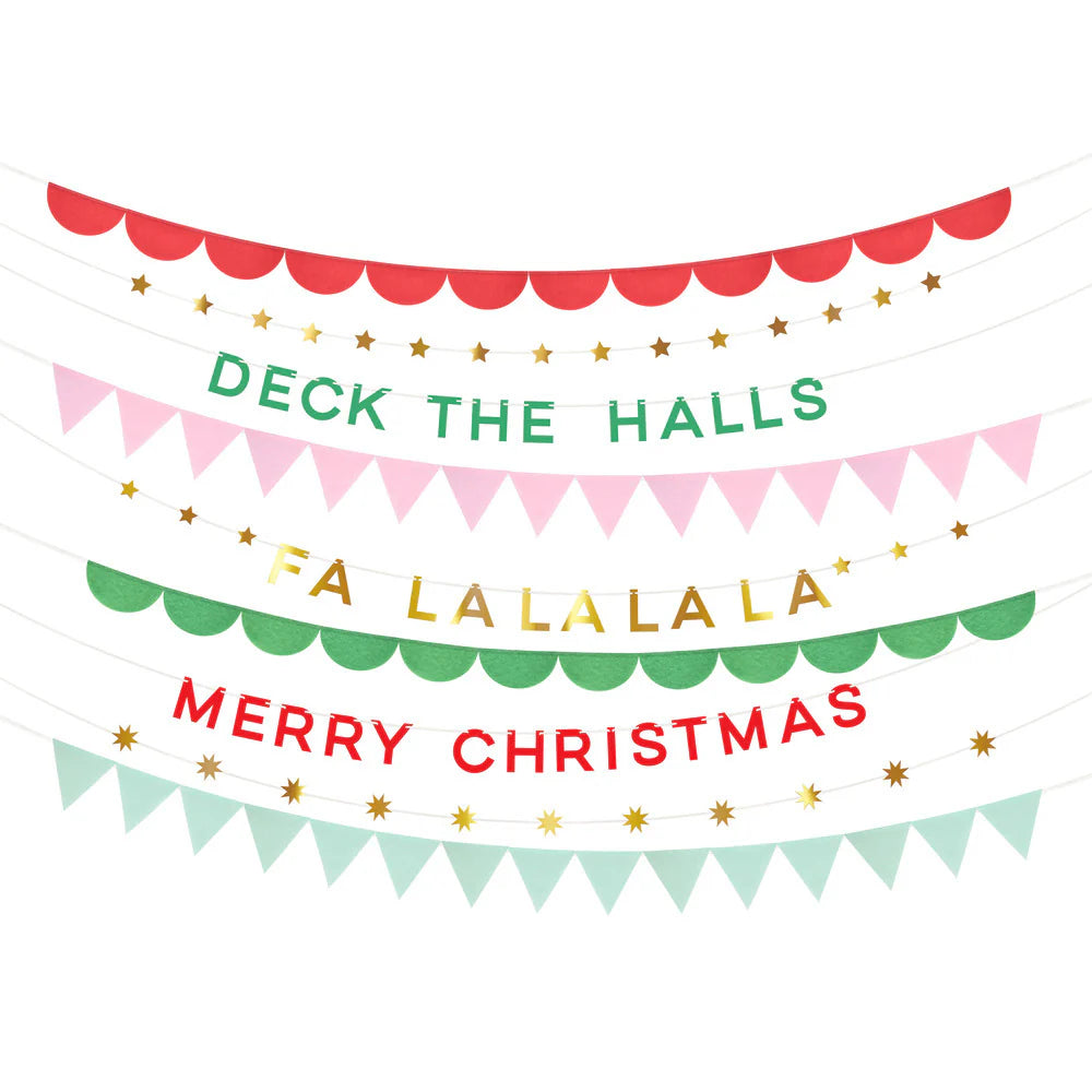 Este fabuloso set de 9 guirnaldas de Meri Meri, hará que tu fiesta de Navidad luzca absolutamente increíble. Con una combinación de colores brillantes, diseños impresionantes y mensajes de Navidad, son el detalle perfecto para decorar !