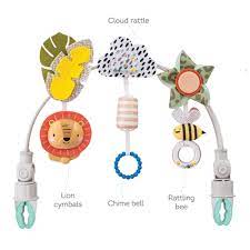Posee 3 juguetes colgantes que brindan mucha actividad para que el bebé sienta y agarre, incluidos los platillos de león, una campana y una abeja que hace sonar. Jugar y agarrar los coloridos juguetes es perfecto para practicar la coordinación ojo-mano, aprender a controlar sus manos y ayuda a desarrollar los sentidos y las habilidades motoras del bebé. Se conecta fácilmente a la mayoría de los cochecitos, carriolas, asientos de automóvil para bebés o mecedoras con grandes clips de plástico ajustables que permiten que el bebé juegue mientras viaja.