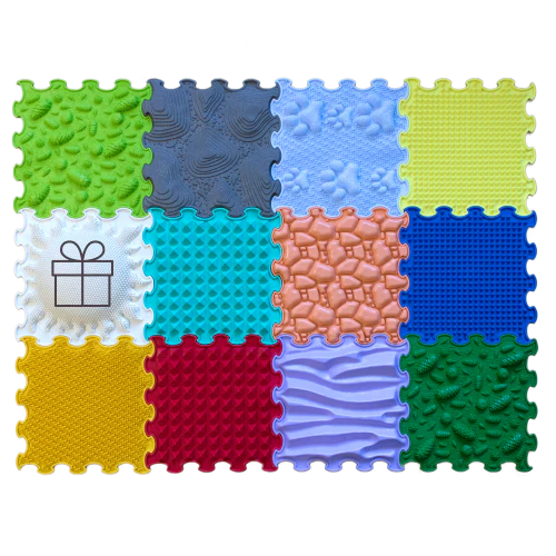 El set incluye 11 alfombrillas de rompecabezas + 1 bestseller ORTOTO “Sol Brillante” como regalo. Contiene todas las texturas ORTOTO.