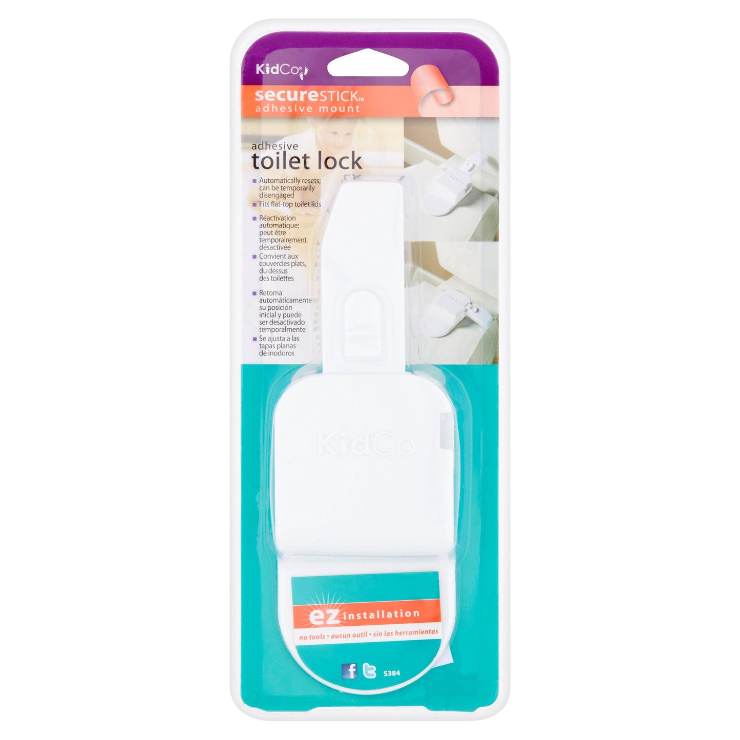 Calza en la mayoría de los inodoros de tapa plana quedando automáticamente restablecido cuando se baja la tapa. La cerradura de aseo adhesivo SecureSTICK mantiene a los niños curiosos a salvo de acceder a los inodoros llenos de agua. El montaje en la tapa exterior ayuda a mantenerla limpieza.