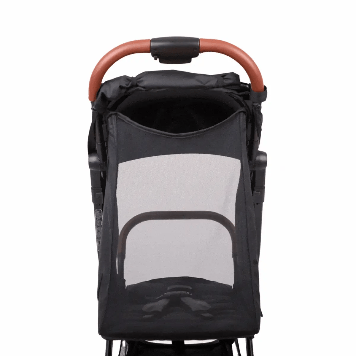 Para los días calurosos en modo reclinado, el respaldo cuenta con una malla que permite una mejor ventilación y circulación del aire, y también con un panel de oscurecimiento para los días más frescos.