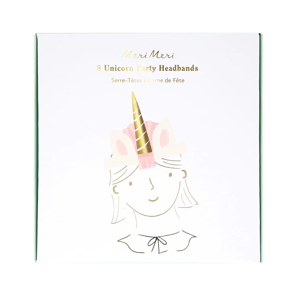 Estas coronas de papel, con cuernos de unicornio en color dorado, orejas y flecos de papel, harán que los invitadosa tu fiesta de unicornios o princesas sientan la magia al instante.