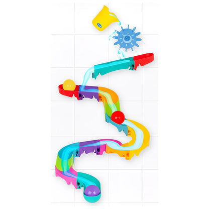 Recoge agua con el vaso y viértela en el engranaje giratorio para ver cómo el agua cae en cascada por la rampa de colores brillantes. Deja caer las bolas en la rampa y observa cómo ruedan, salpicando el agua. La rampa se adhiere fácilmente a la pared de la bañera, lo que te permite crear tus propias configuraciones divertidas.