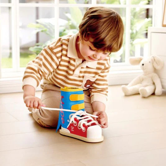 Este juguete educativo ayuda a los niños a aprender a abrocharse los cordones mientras se divierten.