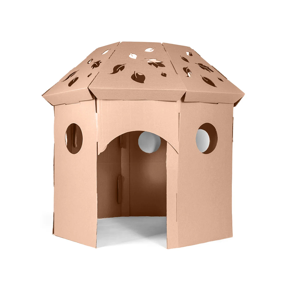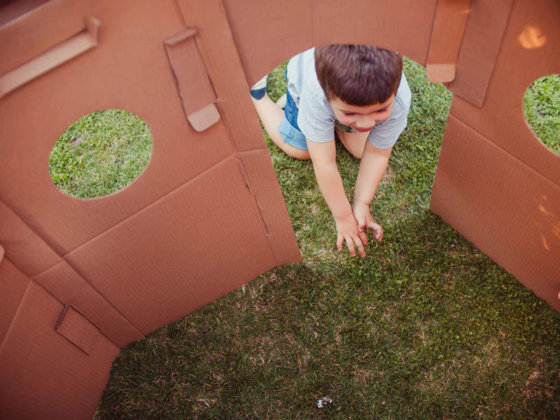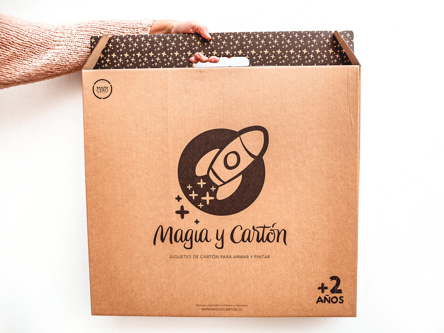 Se puede armar al interior de la casa o al aire libre. Está elaborada con cartón corrugado café de 6 mm de espesor, resistente y perfecto para ser pintado con lápices o témperas.