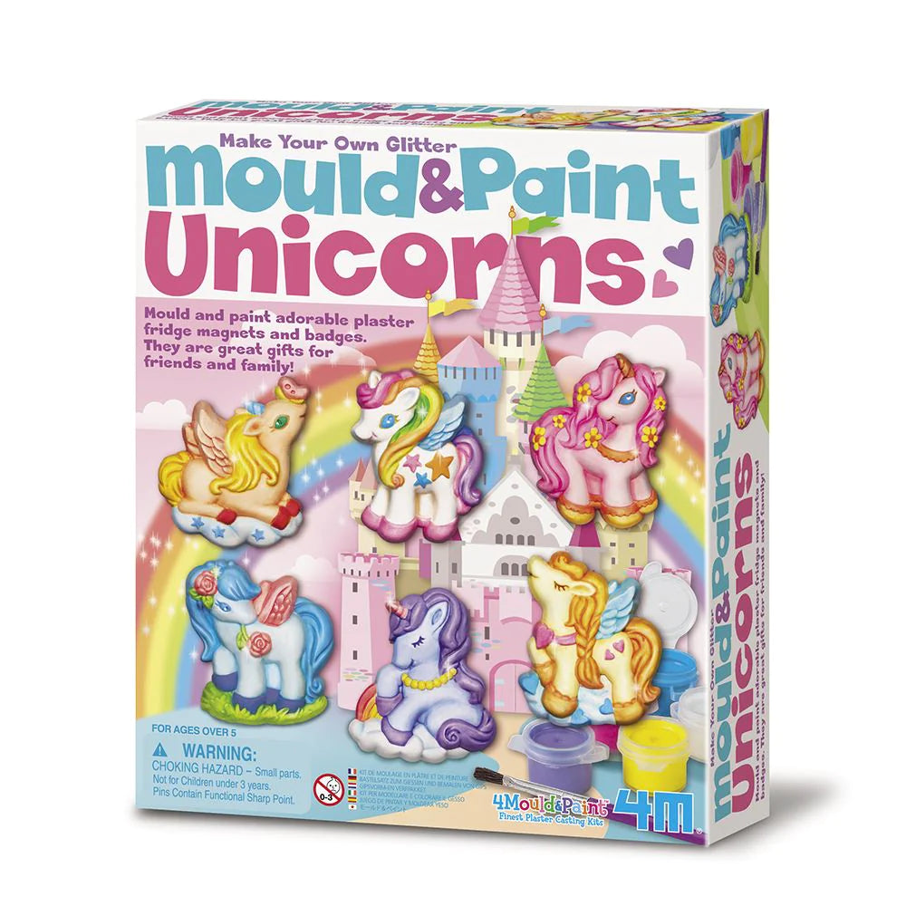 Es un juego de manualidades donde podrán hacer sus propios imanes o prendedores de unicornios utilizando los moldes, el yeso y las pinturas que se incluyen en el kit.