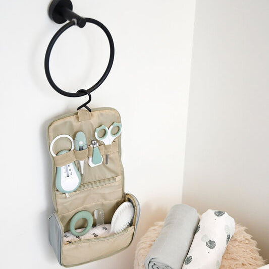 - Incluye: Termómetro de baño, termómetro digital, tijeras, cortaúñas, cepillo para el cabello, anillo de dientes, masajeador de encías, aspirador nasal manual, lima de uñas