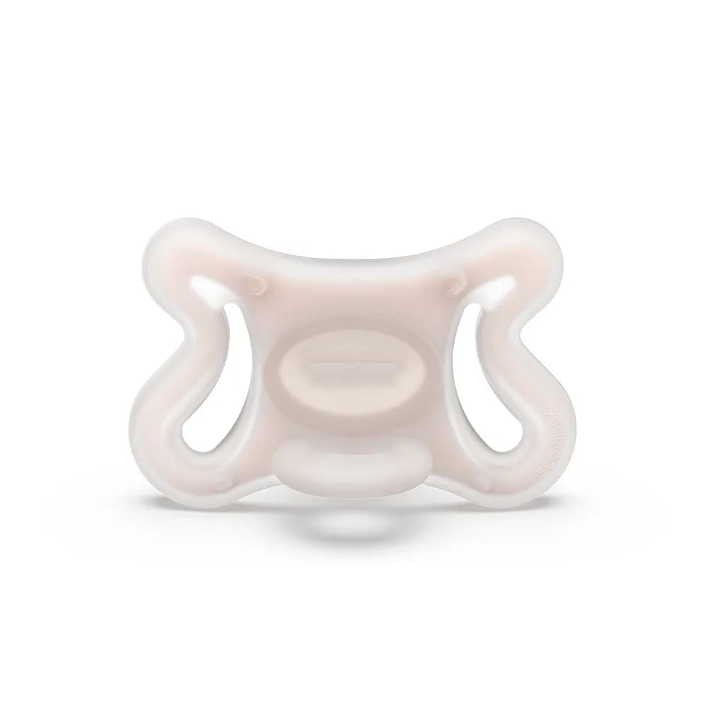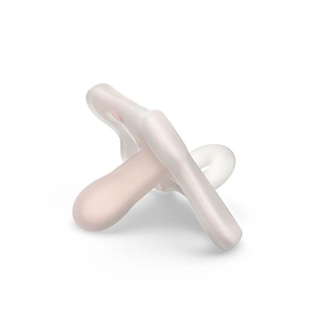 Chupete con tetina fisiológica, diseñado para respetar el desarrollo bucodental del bebé. La tetina de este chupete ha sido diseñada para no invadir la cavidad oral y proporcionar al bebé la misma sensación que experimenta en su estado natural cuando no lleva chupete.
