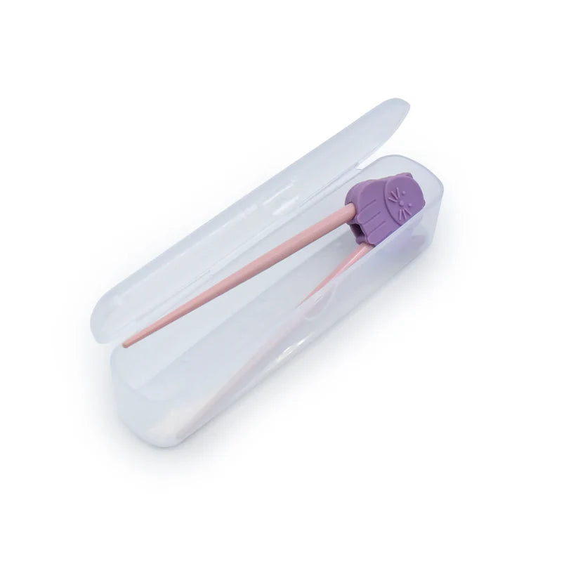 Los palillos con bisagras son perfectos para que los niños (o adultos) aprendan a usarlos. El juego crece con tu hijo, ya que el animal de silicona se puede quitar cuando tu hijo ya no necesite ayuda para usar palitos.