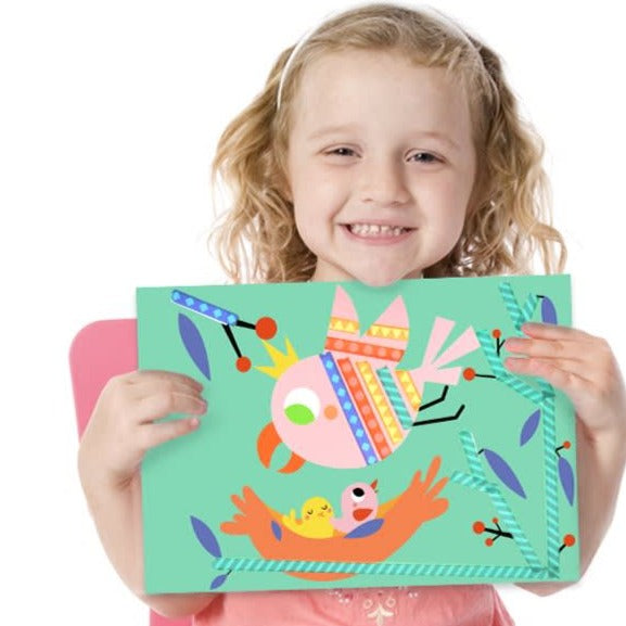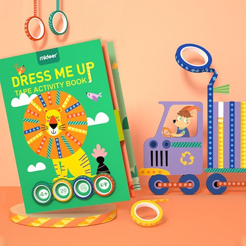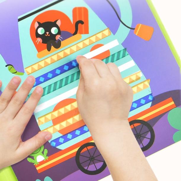 Este set permite a los niños crear escenas artísticas con hermosas cintas de papel. Los niños de 3 a 5 años se divertirán pegando y quitando las cintas. Trae 4 tipos de cintas, y 10 tarjetas impresas por ambos lados, los niños decoran las tarjetas con dibujos y desarrollan su creatividad y apreciación artística. También ayuda a cultivar su motricidad fina. Muy fácil de llevar.