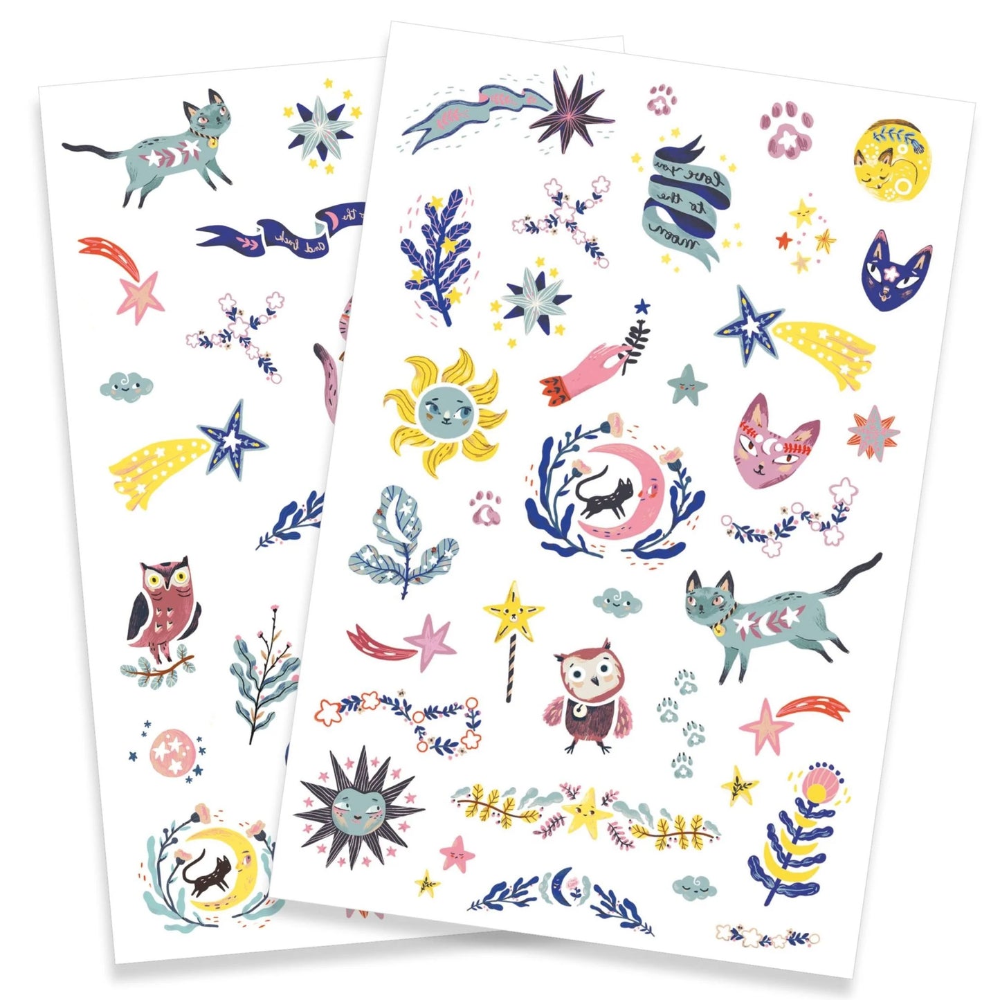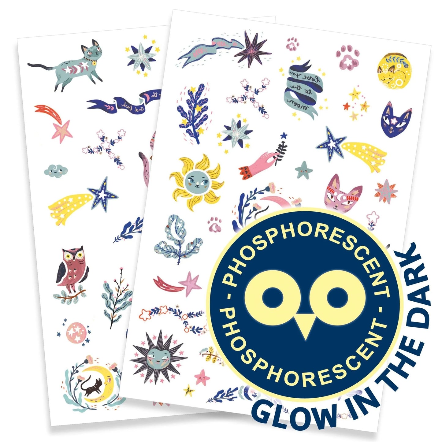 ¿Te gustaría ver cómo te quedan los tatuajes? Djeco trae para ti tatuajes temporales con la temática de "Sweet Dreams". ¡Adivina qué! Brillan en la oscuridad.