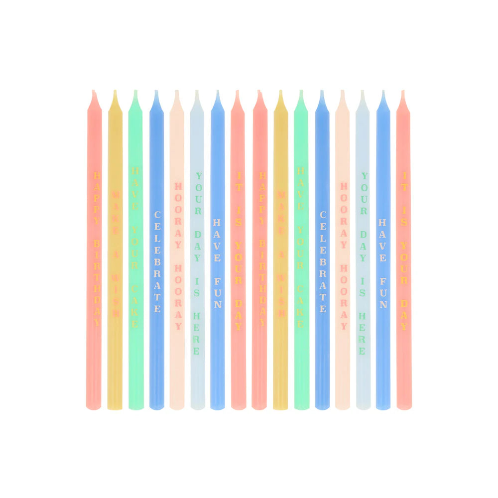 El pack contiene 16 velas largas en distintos diferentes colores y con frases de  cumpleaños en colores  contrastantes.